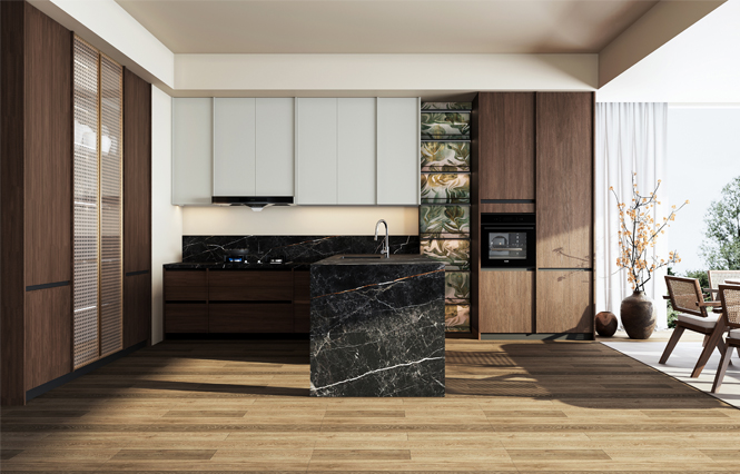 通过hth华体会官网厨柜量体裁柜,定制出适合主厨下厨的烹饪区和洗涤区的舒适高度。